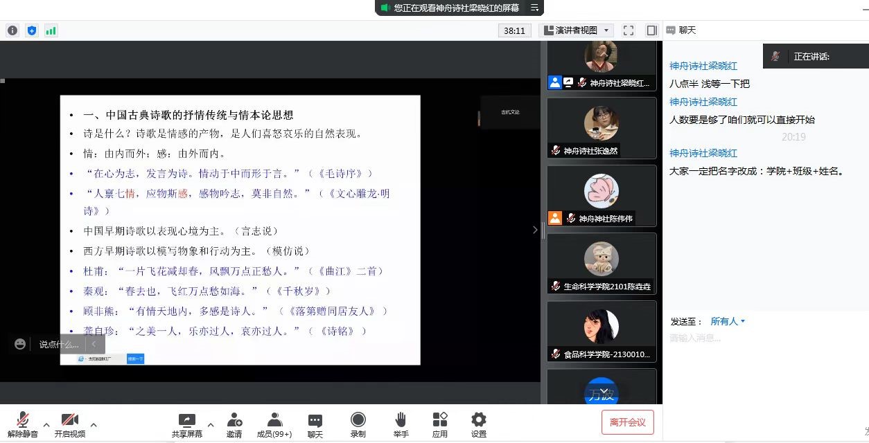 4月21日,bg大游官方网站神舟诗社在线上举办了“赏诗词之韵,鉴名家之情”诗词讲座。本次讲座由bg大游官方网站郭庆财老师担任主讲,约400人聆听。