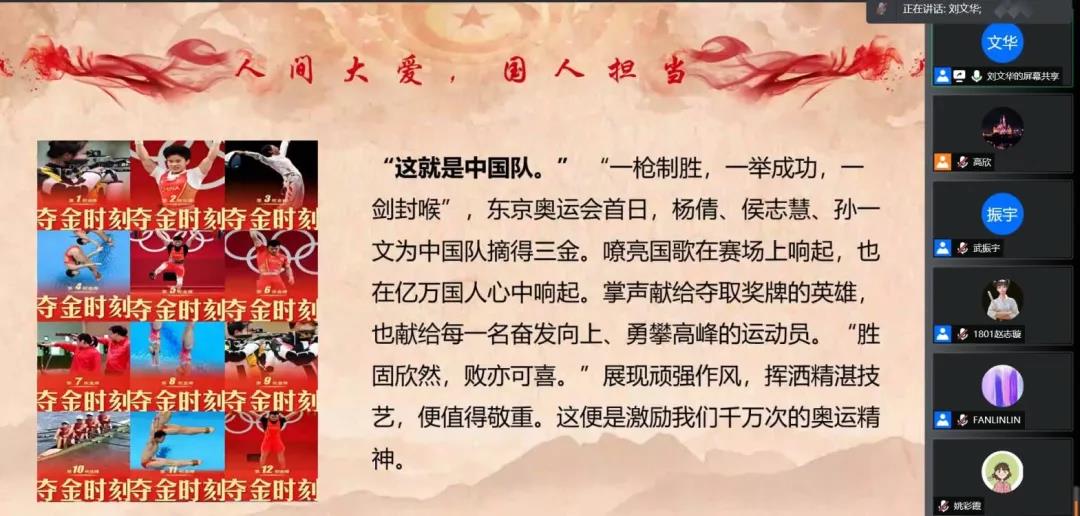 刘文华同志以《人间大爱,国人担当》为主题,从“多方力量汇聚,风雨共肩担当”和“健儿东京拼搏,铸就中国奇迹”两大主题出发进行了分享。她谈到了在暴雨中志愿者的无私奉献、国企的责任担当、汛情下挺身而出的共产党员和奥运场上自信拼搏的运动员们。“有人在汛情一线争分夺秒,有人在抗疫前线日夜坚守,有人在奥运赛场英勇拼搏,每个担当奉献、恪尽职守的中国人都了不起!”刘文华的讲解让参会同志深受感动。李元杰同志说:“同样作为零零后、作为新时代青年老员工,我们应该从小事做起,把平凡的事做得不平凡,把简单的事做到不简单。”赵文文同志讲道:“洪涝发生后,我们国家便及时展开了防汛抗灾工作,在党中央的统一领导下,我们的军人战士、党员群众都纷纷加入抗灾行列,展现了我们祖国万众一心的强大合力。”刘晓琴同志分享道:“在这场抗洪抢险斗争中又一次展现出来‘万众一心、众志成城,不怕困难、顽强拼搏,坚韧不拔、敢于胜利’的伟大抗洪精神,是中国人民弥足珍贵的精神财富。”
