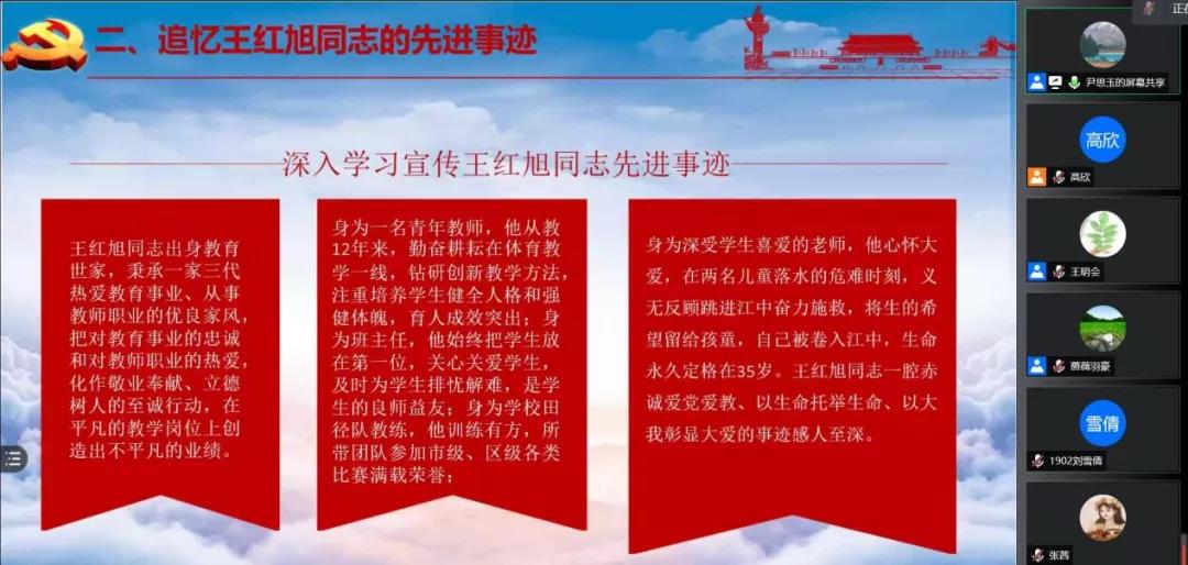 尹思玉同志以“致敬教师楷模,做时代追光者”——向王红旭同志学习为主题,讲解了王红旭同志的先进事迹。她讲道:“在两名儿童落水的危难时刻,王红旭同志义无反顾跳进江中奋力施救,将生的希望留给孩童,自己被卷入江中,生命永久定格在35岁,他以生命托举生命、以大我彰显大爱,用短暂一生诠释了为人师表、行为世范的深刻意义。中宣部授予王红旭“时代楷模”称号,我们要以王红旭同志为榜样,坚定理想信念,厚植教育情怀,立足本职岗位,立志为祖国和人民贡献力量。”