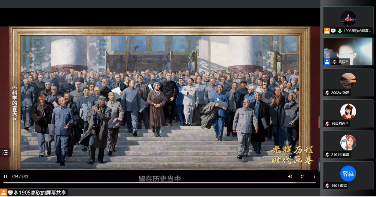 全体同志观看了山西干部在线平台视频《科学的春天》。本集短视频《科学的春天》介绍的是著名美术家丁一林创作的同名油画作品。1978年3月,全国科学大会在北京人民大会堂召开,油画《科学的春天》以邓小平与科学家们在会后走出会场的形象,展现了大会给科技工作者们带来的喜悦、振奋的精神面貌。老一辈科学家,为祖国的科技事业奉献了一生。作者丁一林在收集资料筹备创作的过程中,被他们的精神深深打动。丁一林介绍:“科学家们从大会堂门前涌出,他们面带喜悦、意气风发,就像春潮涌动。我用了很长时间来塑造这些科学家的形象,希望通过这件作品来为他们造像,把他们留在画布上,留在历史当中。”