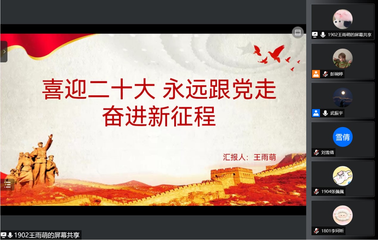 4月16日,bg大游官方网站“学雷锋,送温暖”小组员工党支部在腾讯会议开展“喜迎二十大、永远跟党走、奋进新征程”主题党日活动。会议由支部副书记武振宇主持,支部全体党员和积极分子参加。员工党员王雨萌同志担任主讲人。