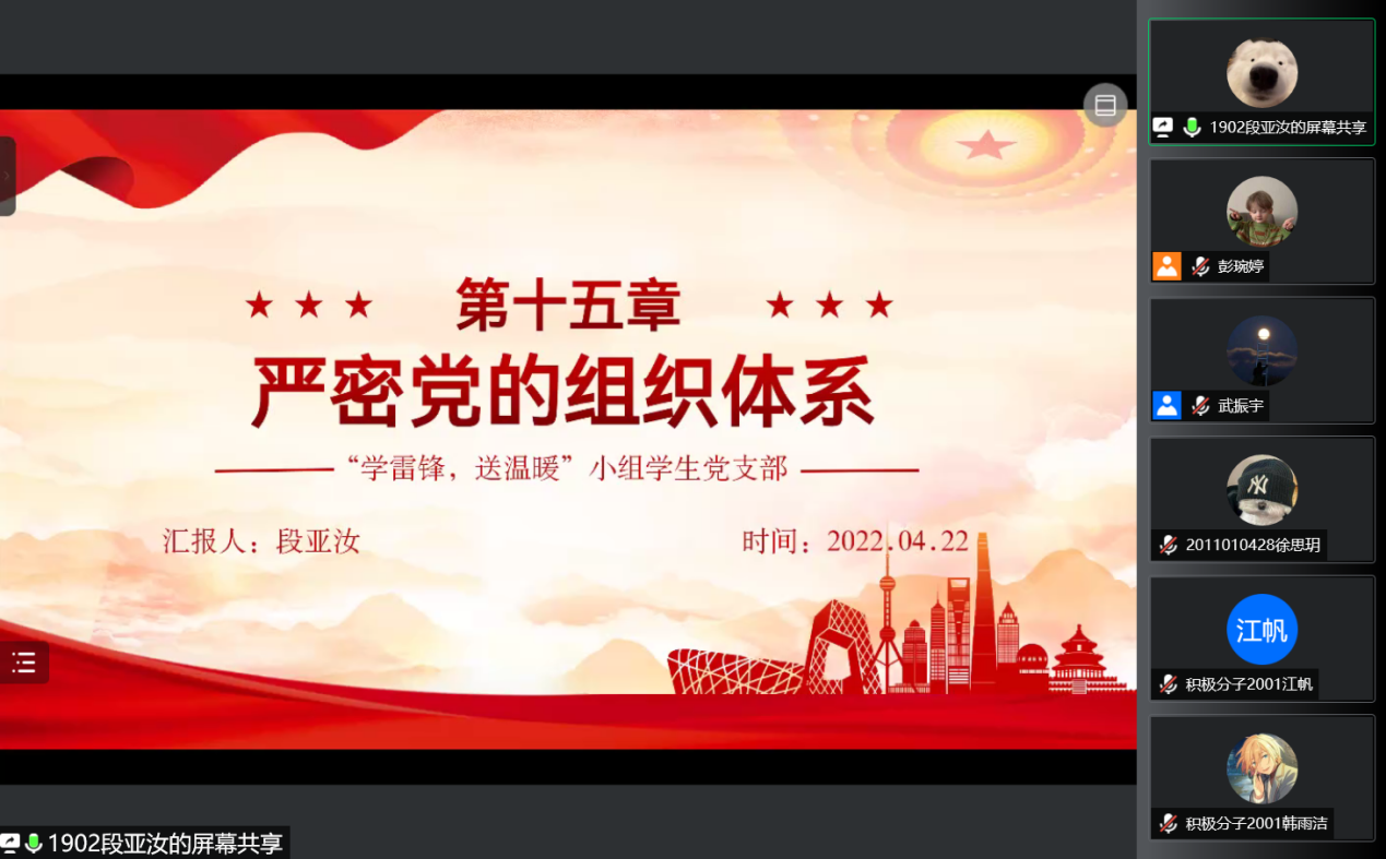 4月22日,bg大游官方网站“学雷锋,送温暖”小组员工党支部在腾讯会议学习山西干部在线平台视频与《中国共产党组织建设一百年》第十五章专题学习。活动由支部副书记武振宇主持,支部全体党员和入党积极分子参加。员工党员段亚汝同志担任主讲人。