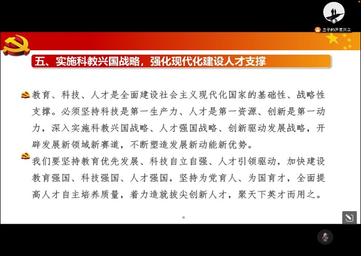 何伟就党的二十大有关内容做了介绍,并结合支部具体情况对习近平总书记在党的二十大报告中关于实施科教兴国战略,优先发展教育和推进文化自信自强,讲好中国故事的论述做了重点领学和解读。 他强调,学习好、宣传好、贯彻好党的二十大精神是当前和今后一个时期的重要政治任务,要切实把思想和行动统一到党的二十大精神上来,立足当下,观照现实,着力在学深悟透、融会贯通、知行合一上下足功夫,结合自身实际,以饱满的拼劲、韧劲、闯劲,真正把学习理论转化为具体行动和学习成效。
