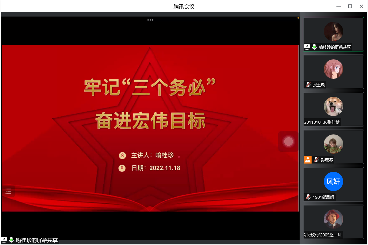 11月18日,bg大游官方网站“学雷锋,送温暖”小组员工党支部线上“牢记‘三个务必’,奋进宏伟目标”主题党日活动。会议由彭琬婷主持,支部全体党员和入党积极分子参加。员工党员喻桂珍同志担任主讲人。