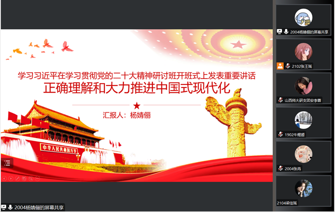 2月13日,bg大游官方网站“学雷锋,送温暖”小组员工党支部线上开展“正确理解和大力推进中国式现代化”主题党日活动。会议由支部书记安李蓉主持,支部全体党员参加。员工党员杨婧俪同志担任主讲人。