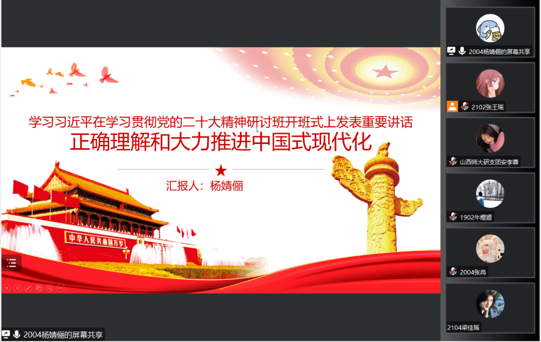 2月13日,bg大游官方网站“学雷锋,送温暖”小组员工党支部于线上开展“正确理解和大力推进中国式现代化”主题党日活动。会议由支部书记安李蓉主持,支部全体党员参加。员工党员杨婧俪同志担任主讲人。