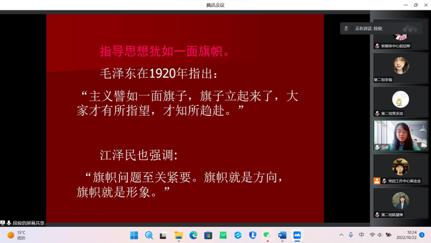 bg大游官方网站副经理段俊,以“指导思想犹如一面旗帜”开题,为大家讲解了中国共产党的指导思想。她指出,将党的指导思想与中国具体实践相结合是推进我国发展事业行稳致远的重要前提。