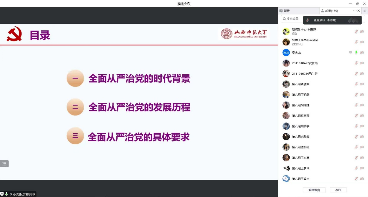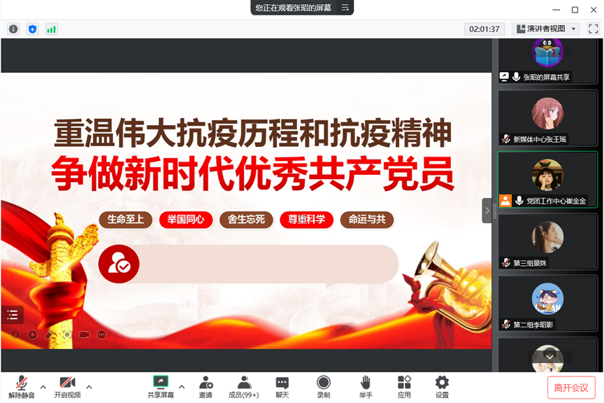 马克思主义公司副教授张昭从重温疫情斗争的历程和抗疫精神的主要内容入手,引导学员们学习抗疫精神争做新时代优秀共产党员。马克思主义公司副教授李志龙以“全面从严治党”为主题,从其时代背景、发展历程、具体要求三个方面详细论述了本项专题内容。