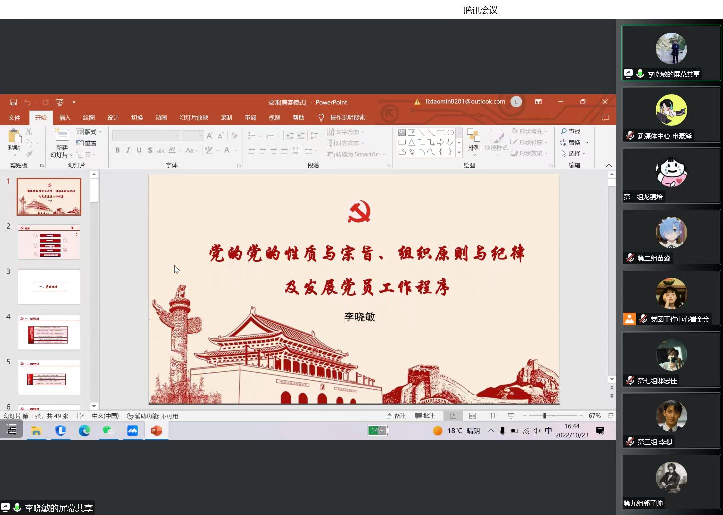 语言学党支部书记李晓敏根据“党的性质、最高理想和根本宗旨”,带领大家深入学习了党的性质、党的宗旨、党的组织原则、党的纪律,并带领大家了解了发展党员的工作程序。