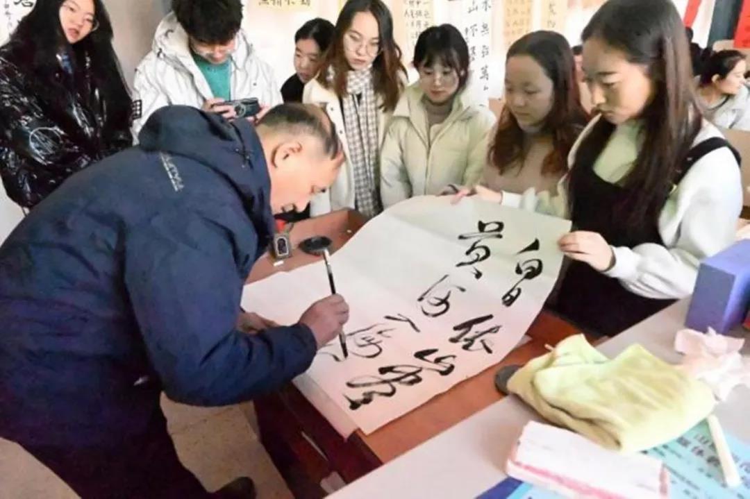 辅导员魏玉平老师挥毫泼墨, 舞动丹青,为班级题字两幅,同学们深受感触,创作出一幅幅生动传神的作品。现场展出的作品题材丰富多样,有硬笔书法、毛笔书法、Procreate、手绘画等作品。工作人员发放贴画,同学们为自己喜欢的作品投票。同时进行说文解字抢答环节,同学们争相上台书写正确答案。投票抢答环节结束后,工作人员对说文解字进行讲解;绘画作品作者对作品进行了讲解说明。