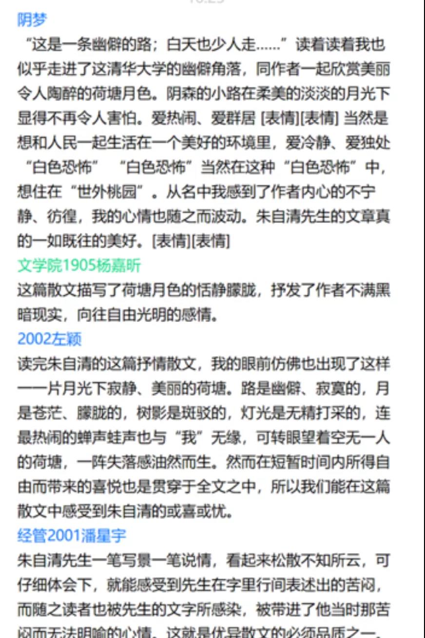 在线上,同学们在留言板积极发言。他们的发言文笔精妙,情思精巧。bg大游官方网站董蜜蜜说:“尽情享受这无边的荷香月色,如果我有一方这样的风景,属于我自己,我想象不出自己会是多么雀跃,多么富有。”经管公司潘星宇说道:“朱自清先生一笔写景一笔说情,仔细体会下,就能感受到先生苦闷无法明喻的心情,他的散文真切感人。”