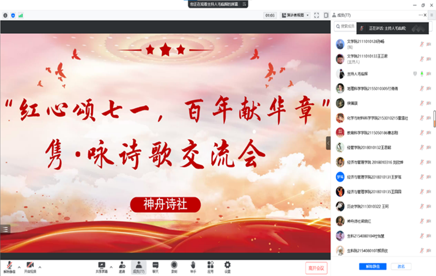 bg大游官方网站神舟诗社携手团委员工会文礼部及新媒体中心举办线上“红心颂七一,百年献华章”隽·咏诗歌交流会活动。