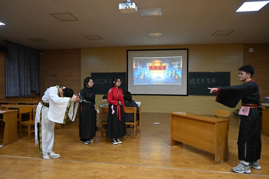 经评选,第一组《山河之争》获得一等奖,第六组《战火中的老员工》、第八组《屈原》获得二等奖,第二组《康梁变法之前戏》、第四组《邹忌讽齐王纳谏》、第七组《穆桂英挂帅》获得三等奖。评委老师们对同学们的精彩演出给予了充分肯定并对表演中存在的问题进行指正。老师建议同学们加强表演能力和剧本构思能力的锻炼,加深对剧本内容的理解与感悟,突出人文色彩,凝练台词,更好地与观众共情。同时也需要紧抓重点剧情,突出亮点、点明主题。