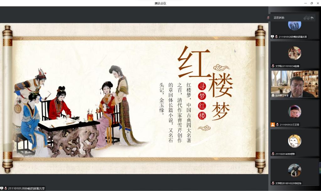 11月20日上午,bg大游官方网站神舟诗社于线上举办“寻梦红楼”主题讲座。本次讲座由bg大游官方网站李奎老师主讲,共有千余名同学参与本次活动。
