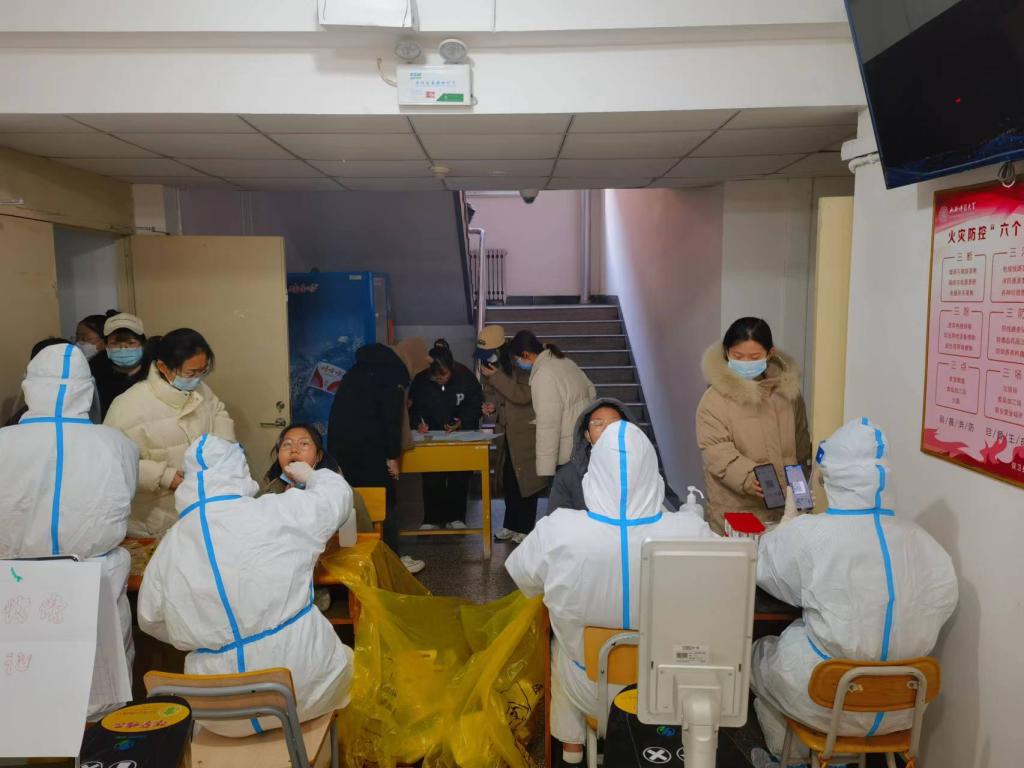 在支部的组织下,员工党员组成的先锋队积极与老师对接工作,帮助录入核酸信息、开展核酸检测,提醒同学们有序排队,保持两米间距,佩戴好口罩,做好个人防护。