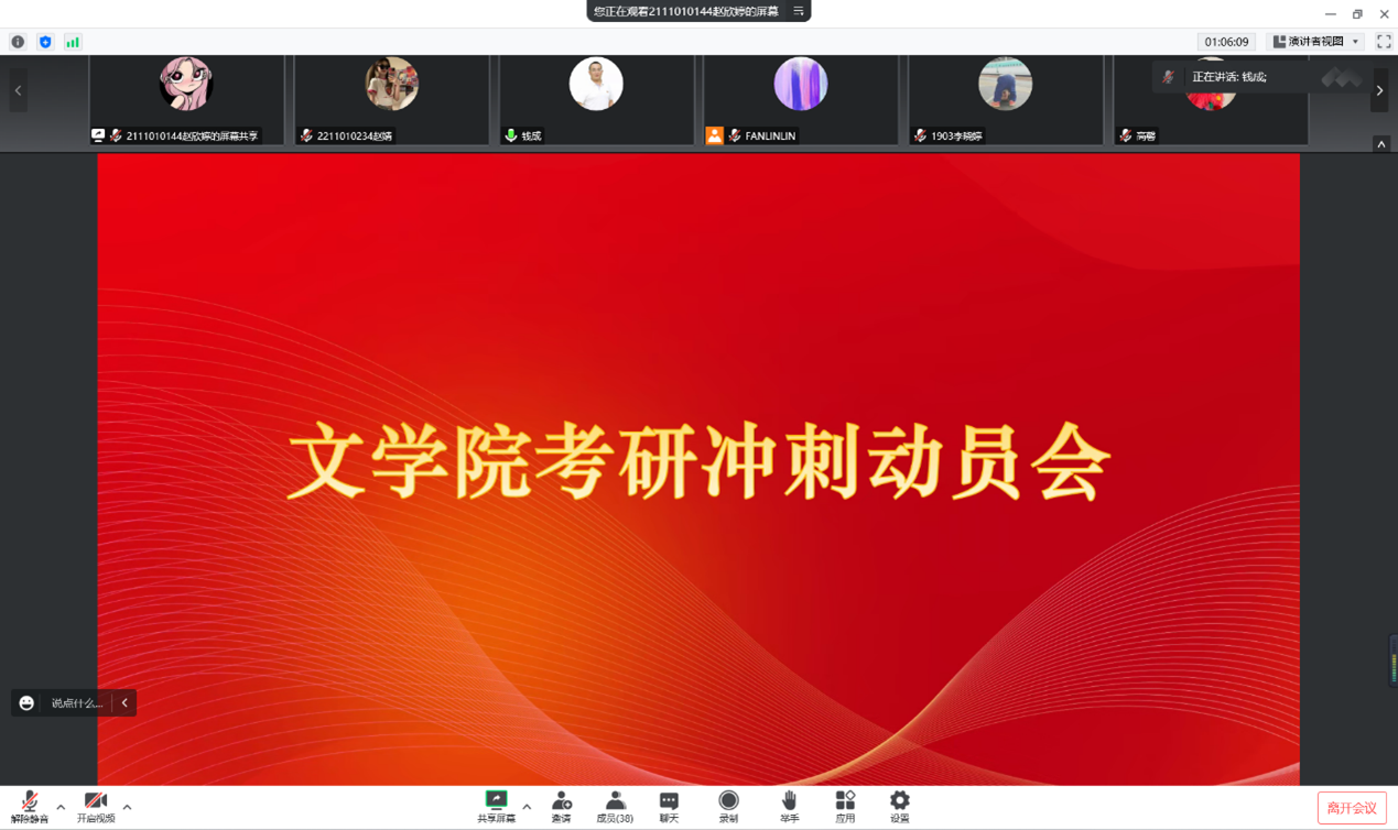 12月21日下午,bg大游官方网站于线上举行bg大游官方网站考研冲刺动员会。本次会议由院团委书记樊琳琳主持,公司党委书记钱成、副经理段俊出席,19级考研同学参加。会议由1903班李晓婷,就读于兰州大学的2020届毕业生赵连国,就读于内蒙古师范大学的2021届毕业生高馨三位员工代表主讲。
