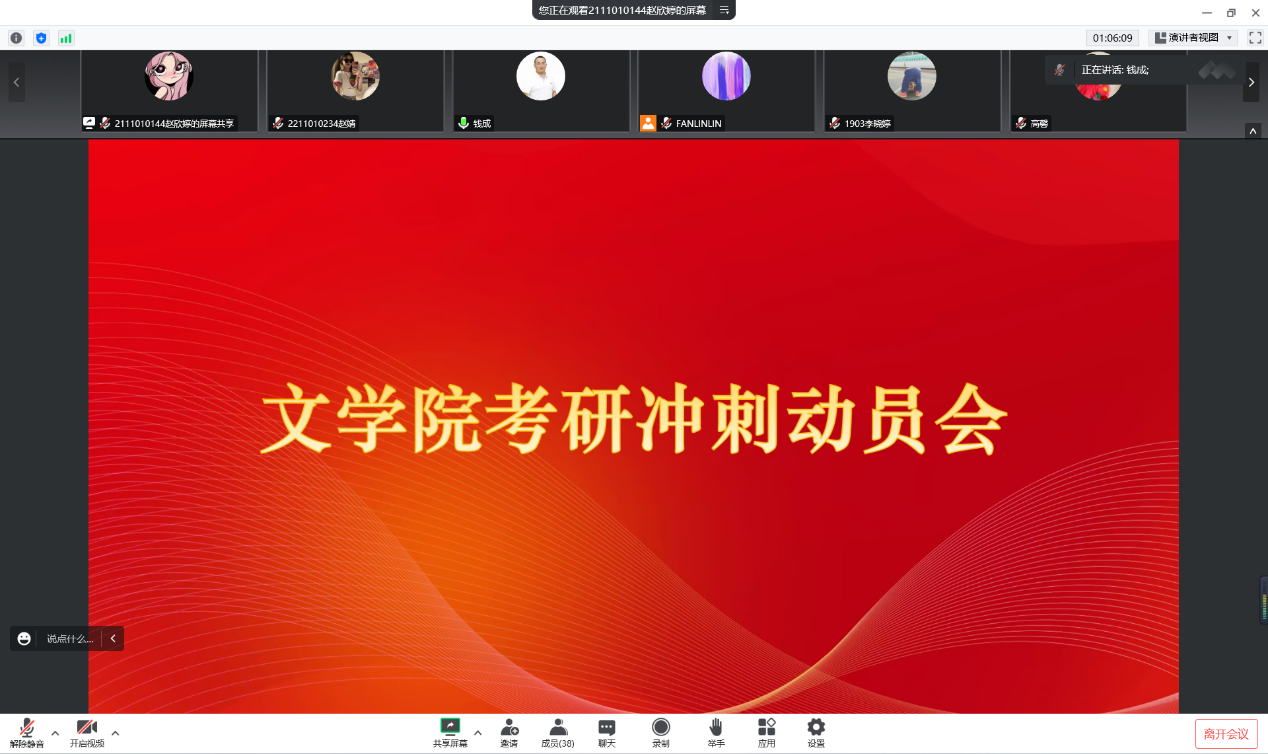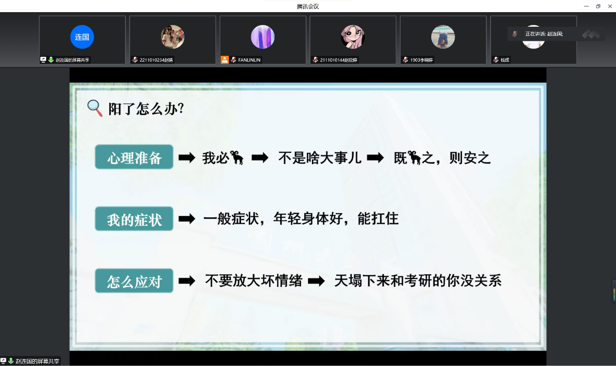 12月21日下午,公司党委书记钱成、副经理段俊、团委书记樊琳琳对“书院制”分管宿舍考研员工进行线上动员。此次线上会议通过邀请李晓婷、赵连国、高馨三位员工代表分享自己的新冠恢复经验以及考研经验,鼓舞面临新冠疫情以及考研压力的同学们积极备战即将来临的研究生考试。院领导也通过本次会议对考研员工表达安抚与祝福之意。此次线上会议的开展,进一步拉近了师生之间的距离,有利于更好地缓解考研员工面对考研与疫情的双重压力,为他们考研确立良好的心态与状态提供了基础。