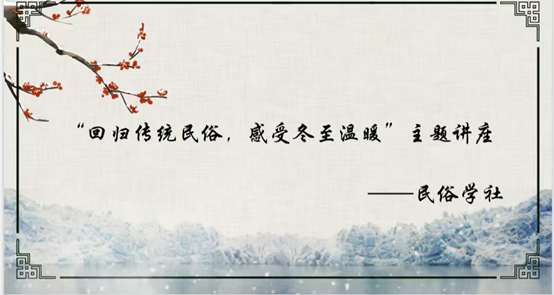 12月22日,bg大游官方网站民俗学社特开展此次“回归传统民俗,感受冬至温暖”主题讲座。讲座参与同学多达315人。