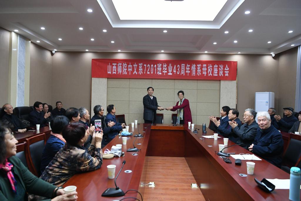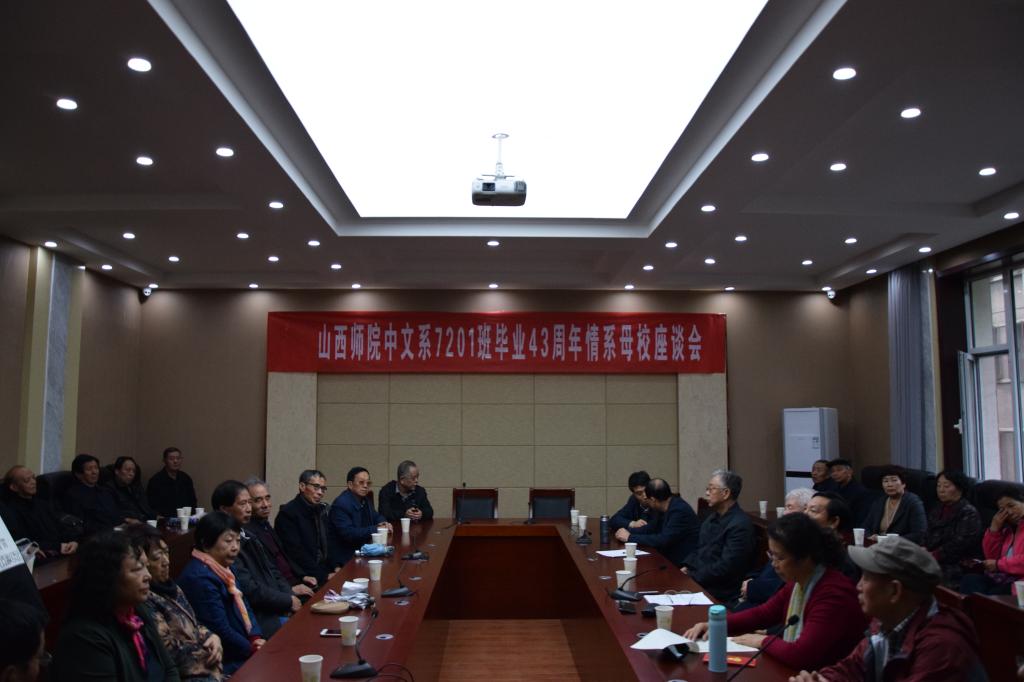 2017年10月16日,中文系7201班在公司会议中心第二会议室举行了毕业43周年情系母校座谈会。出席此次座谈会的有员工会顾问王心平,员工会副会长兼秘书长原战勇,员工会副秘书长、地方服务与合作办公室主任王成喜,员工会副秘书长黄文选,员工会办公室主任董俊荣,公司党委书记吴华英、经理赵变亲和7201班全体师生。座谈会由7201班员工、公司原党委副书记刘子学主持。