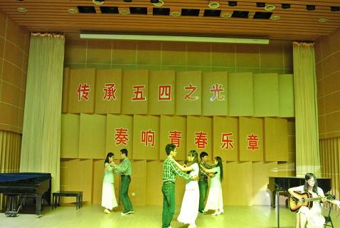 第三幕:《放歌青春未来》:红烛文学社温慧等同学表演的歌伴手语舞《年轻的战场》,展现了青年老员工的朝气与活力、素质与信念。公司青年志愿者协会郭雅丽等同学带来了小品《要当志愿者》,不仅幽默风趣,而且倡导和诠释了志愿服务精神。现场的阵阵掌声就是对他们的肯定与鼓励。接下来是传统形式的“三句半”,忆往昔五四风云,道今日课堂内外,赞颂了先辈们的革命情怀,针砭了“混大学”的不良风气,号召同学们要强化理想、信念与实践。该节目既诙谐搞笑,又引人思考,催人奋进。仝影等同学合作的吉他弹唱《心愿》,将大家瞬时带回到了那个青涩年代的回忆中;那绵长悠扬的琴声和充满深情的歌声,让观众听得感同身受、如痴如醉。最后出场的是由1302班李慧峰等28名同学演唱的——《五月的花海》,整齐划一、精神饱满,歌声嘹亮、气势磅礴的大合唱,集中体现了文院学子的良好精神面貌,表达了他们向“五四”献礼,向青春致敬,向理想挥手,向目标奋进的共同心声。至此,晚会在现场观众雷鸣般的、经久不息的掌声中圆满落幕。