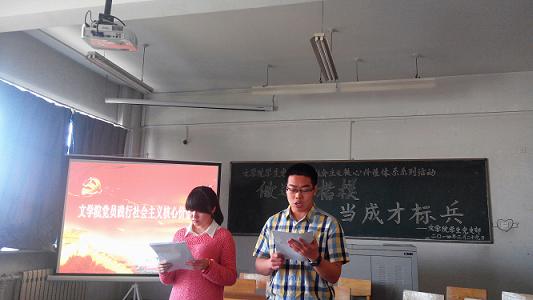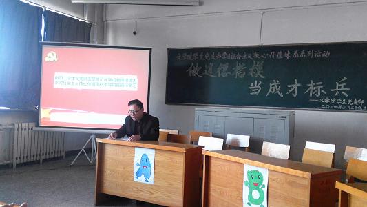2014年3月29日上午9时,bg大游官方网站员工党支部于12406教室举办了以“做道德楷模·当成才标兵”为主题的践行社会主义核心价值观主题实践活动。bg大游官方网站员工第二党支部书记孙学虎老师出席本次活动,参与活动的还有bg大游官方网站员工党员、预备党员及大一各班入党积极分子。