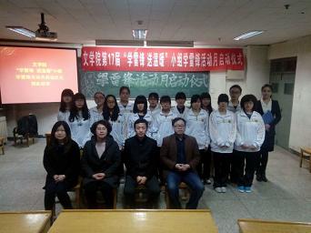 3月4日晚上七点半,公司第17届“学雷锋送温暖”小组(第二季)学雷锋活动月暨2014年青年志愿服务系列活动启动仪式在12106教室顺利举行。公司党委书记吴华英,党委副书记、学工组组长强汾生,公司党委委员、团委书记孙学虎,学工组长助理、专职辅导员李蓉,以及院团委员工会主要干部、各班团支部书记参加了此次活动。