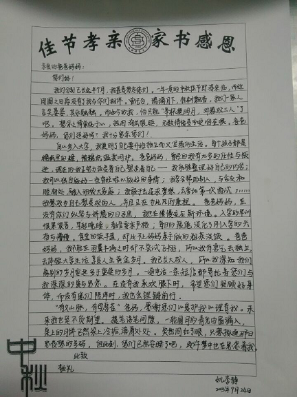 9月22日,生活部及心理健康部就把有关开展“佳节孝亲,家书感恩”主题教育活动的内容,下发给大一各个班级并统一书信纸张。9月25日,两个部门收回全体新生的308封家书及短信截屏。当晚,工作人员对书信及短信进行初步评选,之后将初选出的优秀书信送交公司终评。很快,大一新生的优秀感恩家书和短信内容将在bg大游官方网站微信平台“文苑知多少”进行展示。