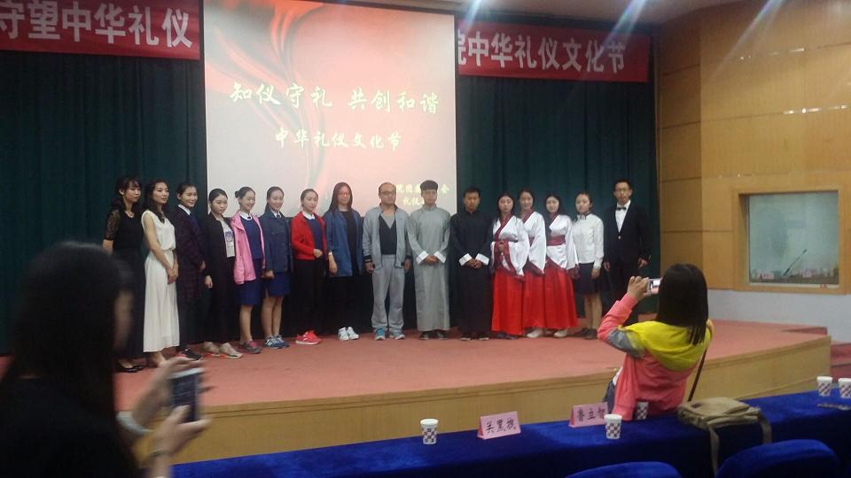 活动伊始,舞者身着汉服,在恢弘磅礴的音乐中娉娉婷婷,一转身、一回眸皆是风情,全场默契般地静寂。舞毕,掌声雷动。借着庄重的气氛,朝歌汉服社成员带来传统礼仪展示,一躬一拜之间,裙踞缥缈,带观众走入一场视觉盛宴,领略所谓 “衣冠上国、礼仪之邦”。传统礼仪之后,空乘专业同学带来的现代礼仪展更是吸引人眼球。她们挽起秀发,着深蓝色制服,从站姿、坐姿、微笑方式等各个方面细节地展示着标准的现代礼仪。由古代到现代,时间更迭,世事变迁,但文化、礼仪的魅力丝毫不减。活动中“以礼待世界”环节让在座的许多人产生共鸣,在讲到“对动物也要以礼待之”的时候,赵娟同学的发言让每个人内心都倍受触动。她呼吁:善待流浪动物,用领养代替购买。