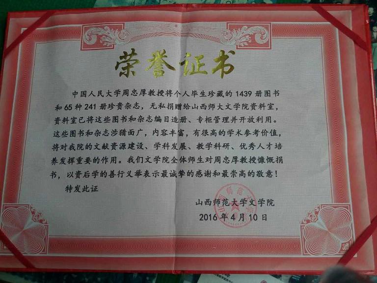 这些捐赠的图书涉及面广,有很高的学术参考价值,足见周教授学识渊博,功底扎实,是后学者的楷模!同时,这些图书和资料将对公司的文献资源开发、团队建设、教学科研、优秀人才培养产生重要的影响。公司全体师生对周忠厚教授慷慨捐书、以资后学的善行义举,表示最诚挚地感谢和最崇高地敬意,对周忠厚教授的家属表示亲切慰问!在此,同样对吴兴业同志的辛苦付出表示由衷地谢意!吴兴业同志是周忠厚教授的弟子、山西师大的员工,在这些图书资料的捐赠联系、运送过程中发挥了重要的桥梁作用!