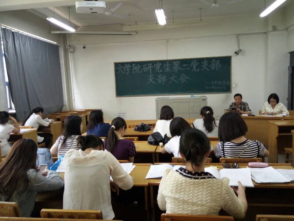 5月30日下午,按照公司党委的“两学一做”学习教育安排部署,研究生第二党支部召开全体党员大会,认真开展上党课、学党章主题教育活动。该党支部所覆盖的古代文学、现当代文学、比较文学与世界文学和写作学等硕士专业的研究生党员,参加了本次学习教育活动。支部大会由党支部书记强汾生主持。