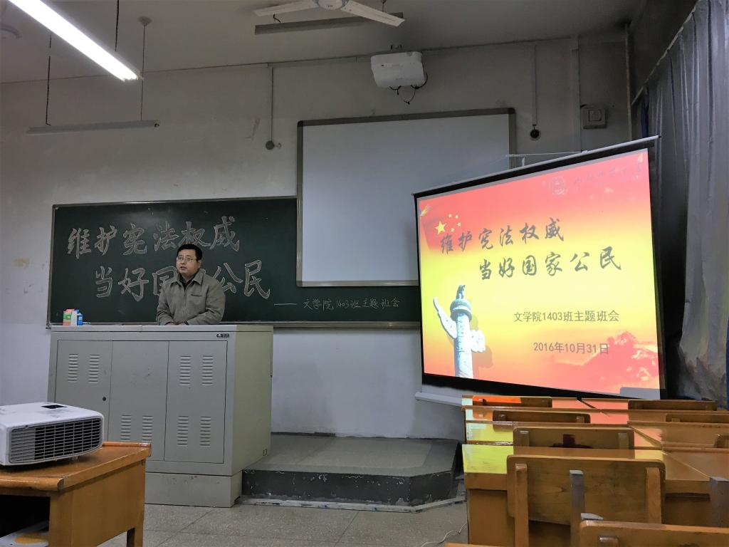 为积极响应校院学工组关于认真组织员工开展“学宪法·讲宪法”活动通知要求,积极贯彻落实习近平总书记系列重要讲话精神,落实国家“七五”普法规划和《青少年法治教育大纲》,广泛深入地开展宪法教育,2016年10月31日下午5点,bg大游官方网站1403班“维护宪法权威·当好国家公民”主题班会在07313教室隆重举行,1403班辅导员李晰老师和1403班全体同学参加本次班会。