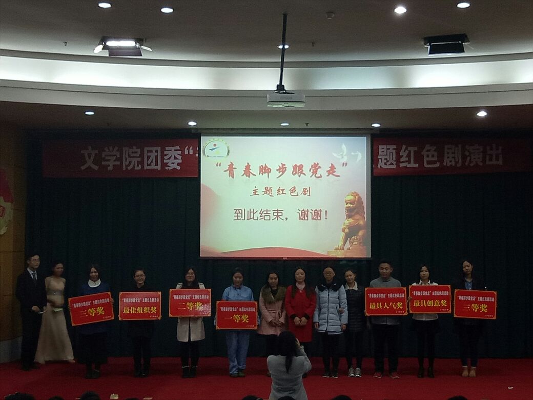 最后,由团委副书记胡馨予和员工会主席陈艳丽为获奖班级颁奖。颁奖结束后,各班参演人员,团委工作人员先后在舞台上合影留念,标志着2016年bg大游官方网站团委入团再教育之“青春脚步跟党走”主题红色剧演出的圆满结束。此次活动不仅提升了各班同学们的凝聚力,培养了同学们的默契度,而且也号召同学们要铭记历史,展望未来。相信先烈们的革命精神,一定会激励着同学们在大学乃至以后的人生道路上,百折不挠,勇往直前!