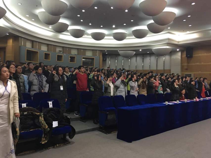 演出开始前,公司团委为观众们播放了视频《入学初体验》,短短十分钟的视频,不仅记录了大一同学初入大公司园时的记忆,也向大家展示了他们入学以来的收获及对未来的美好憧憬。视频结束后,为了让同学们牢记自己共青团员的身份、铭记自己的责任,团委特组织现场的同学们重温入团誓词,面向团旗进行了宣誓。