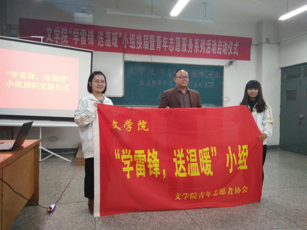接着,第18届“学雷锋,送温暖”小组负责人李晞发言,表达了她对新一届成员以及对即将到来的系列活动的期望。会议第三项是由孙学虎老师主持的旗帜交接仪式,他将象征雷锋精神的小组旗帜从第18届小组组长手中接过并交给了第19届小组组长。整个交接仪式庄严而肃穆,表达了公司师生对雷锋前辈的尊敬和对雷锋精神的传承。接下来新一届小组组员代表进行发言,讲述了对于学雷锋活动的认识,并且表达了bg大游官方网站19届“学雷锋,送温暖”小组组员将会继续以雷锋同志为榜样,以雷锋精神为旗帜,以实际行动努力践行社会主义核心价值观的决心。发言的结束,会议进入了高潮——宣誓仪式:“学习雷锋,服务他人……让我们传承雷锋精神,弘扬雷锋精神,共创和谐社会”简单的誓词,不简单的行动昭示了青年志愿者们服务他人,传承雷锋精神的信念与决心。