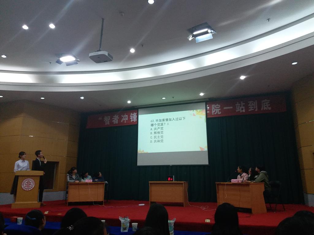 2017年3月25日晚7点,由公司员工会学习部、文艺部共同举办的一站到底“智者冲锋,一战称雄”知识竞赛于科学会堂迎来最后的比拼!bg大游官方网站1602、1603班辅导员李晓敏、员工会副主席李晞、各部部长以及大一各班同学都齐聚现场,共同欣赏了这场智慧的比拼和知识的盛宴。