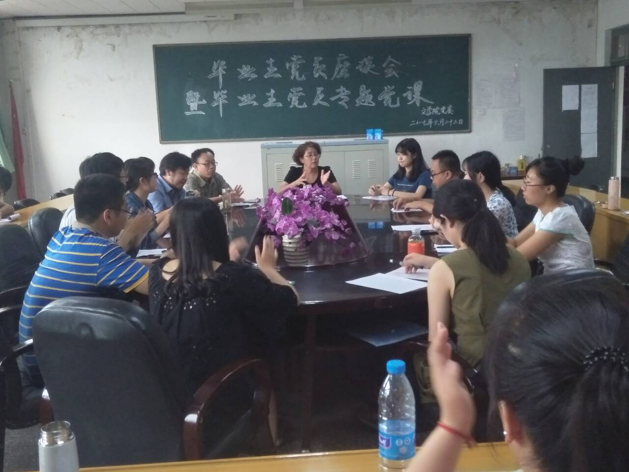毕业生党员座谈会后,吴华英书记为全公司党员讲授了“维护核心见诸行动——学习践行党的十八届六中全会精神”的主题党课,党课从“十八届六中全会的重大成果和重大意义”、《准则》和《条例》的主要内容、我们如何以实际行动践行党的十八届六中全会精神三个方面进行了分析和阐述。她希望大家能以十八届六中全会精神为指引树立坚定的理想信念,严格遵守党的法纪,时刻牢记党员身份,在教学、科研、学习和生活等各方面率先垂范,发挥模范带头作用,用实际行动维护党中央权威和习近平总书记的核心地位,用优异成绩为党旗添彩。