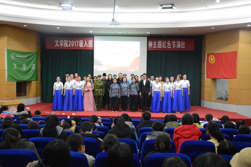 为学习贯彻十九大精神,培养员工爱国主义精神,12月17日晚,bg大游官方网站团委在科学会堂二层举办入团再教育之学习贯彻十九大精神主题红色节演出,公司党委副书记钱成、bg大游官方网站团委副书记樊琳琳、bg大游官方网站1703班辅导员郭飞以及团委、员工会干部与2017级团员共同观看了演出。