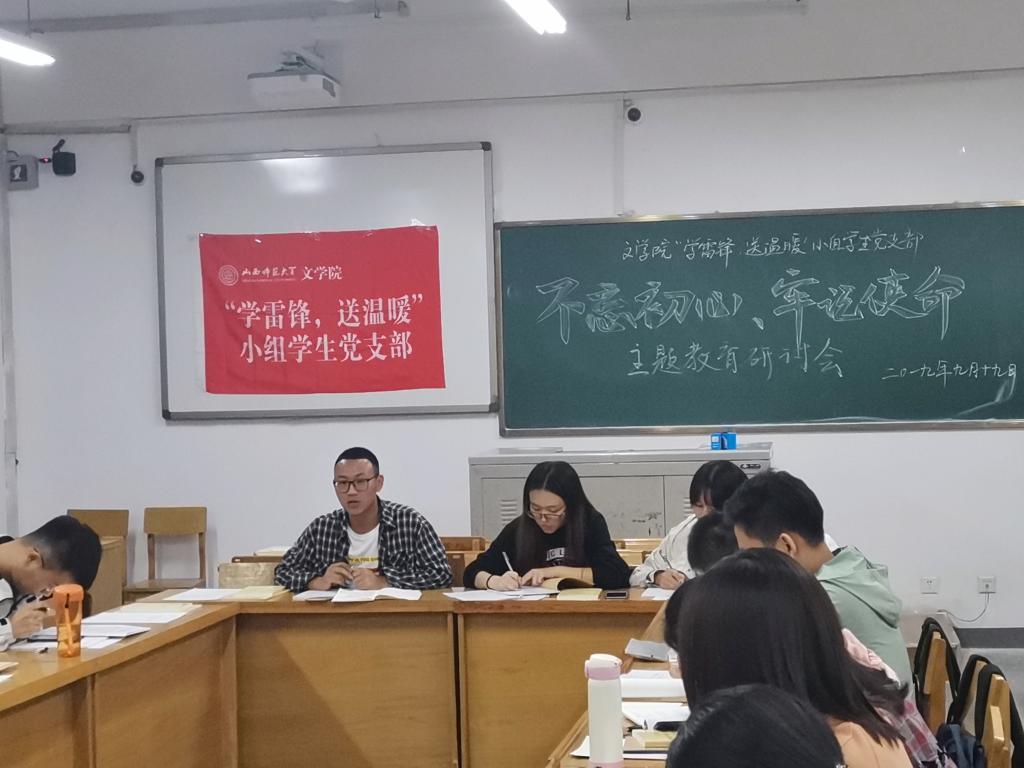 9月19日晚,bg大游官方网站“学雷锋,送温暖”小组员工党支部在12406举行“不忘初心、牢记使命”主题教育研讨会,研讨会由郭豪杰主持、荣娇主讲。