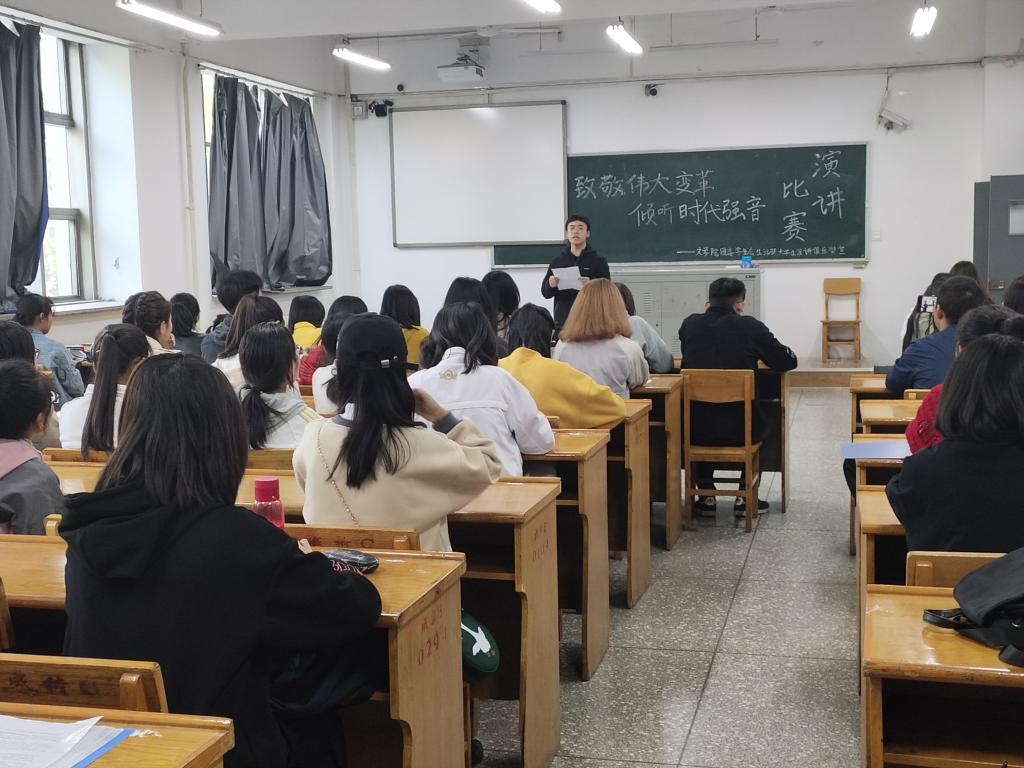 10月26日中午,bg大游官方网站团委员工会生活部和老员工演讲俱乐部在12206教室联合举办了“致敬伟大变革,倾听时代强音”主题演讲比赛决赛。bg大游官方网站团委副书记樊琳琳、员工会副主席李玲及部分部长应邀担任评委。经过各班初选14位选手参加决赛。