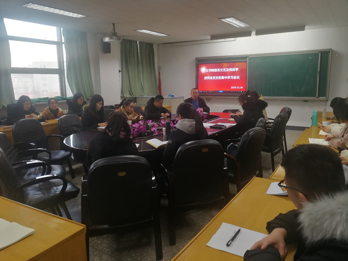 12月26日下午,结合学习贯彻党的十九届四中全会精神和重温习近平总书记“三篇光辉文献”文件要求,bg大游官方网站语言文艺及民俗学研究生党支部组织全体支部党员和入党积极分子召开专题学习讨论会,集中学习了党的十九届四中全会决议和“三篇光辉文献”之习近平总书记在推动中部地区崛起工作座谈会上的重要讲话。活动由党支部书记钱成主持。