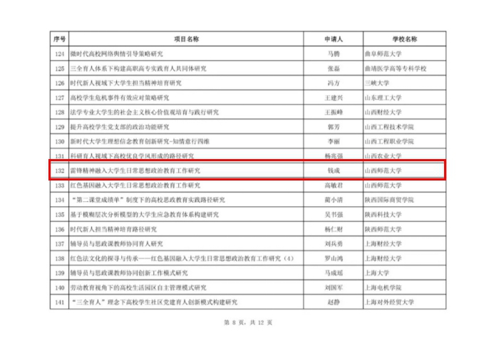 3月6日,教育部社科司公布了2020年度教育部人文社会科学研究专项任务项目(高校辅导员研究)评审结果,共200个项目通过专家评审。公司辅导员钱成主持的项目《雷锋精神融入老员工日常思想政治教育工作研究》成功入选。