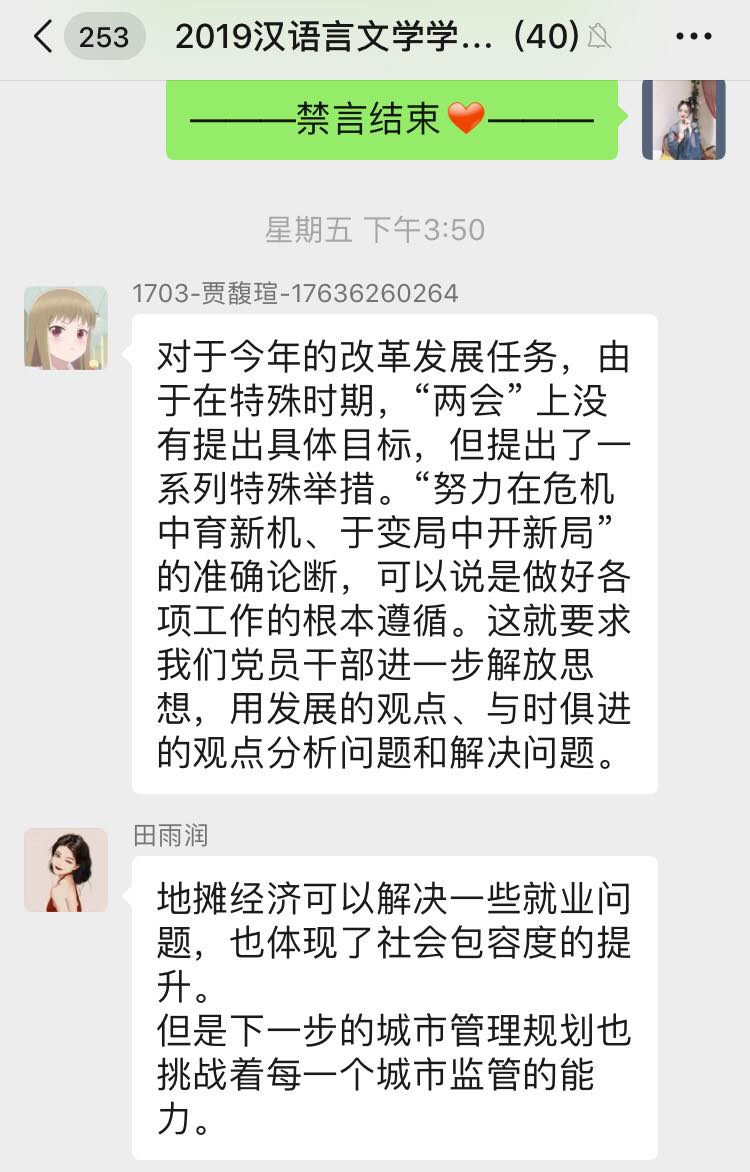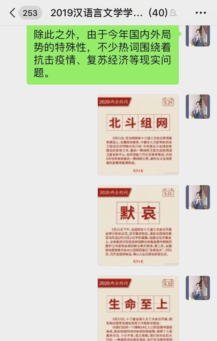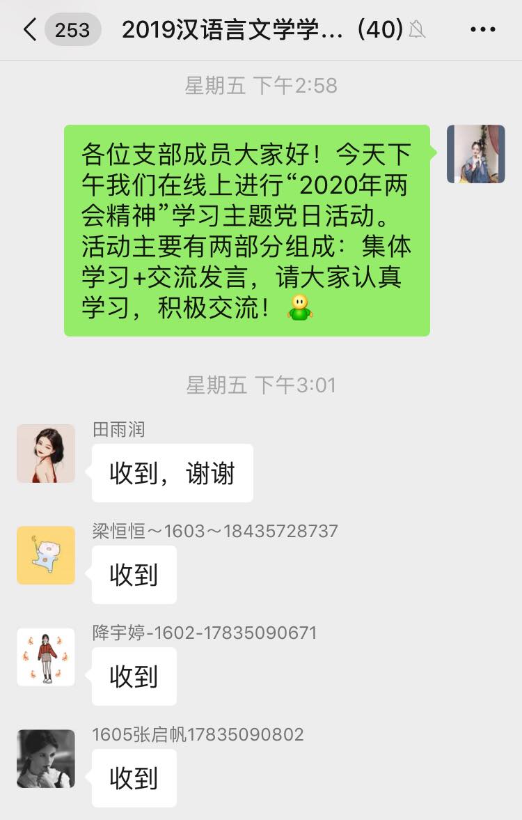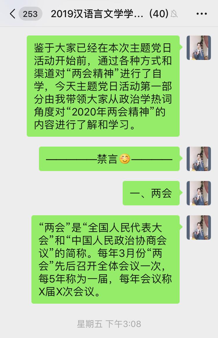 6月5日下午,bg大游官方网站汉语言文学员工党支部开展学习“2020年两会精神”线上专题党日活动,支部全体党员参加本次会议,会议由支部书记侯昕昊主持。