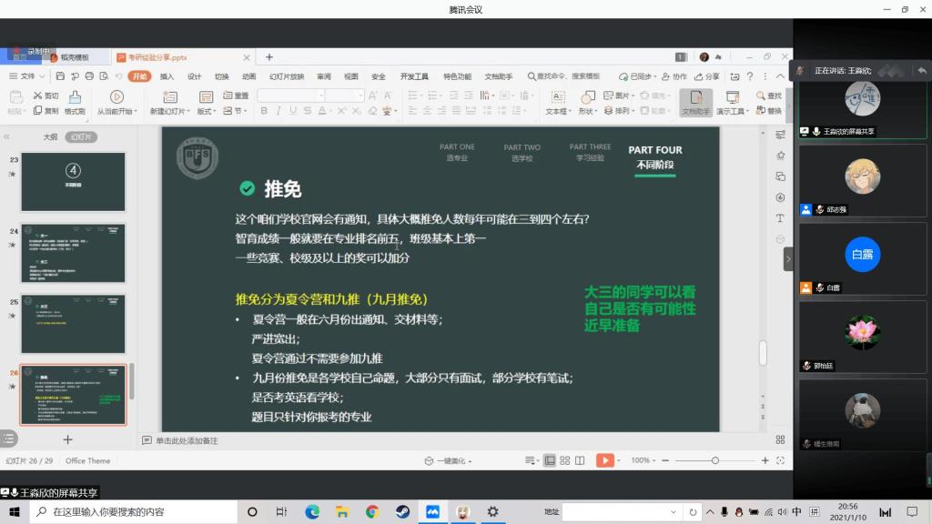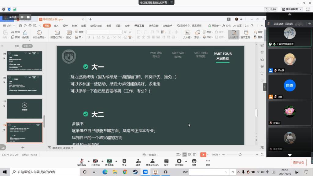 1月10日晚,bg大游官方网站举办线上考研经验分享交流会,由bg大游官方网站学习生活作风建设中心承办。由16级优秀毕业生——北京外国语大学王淼欣担任主讲人。