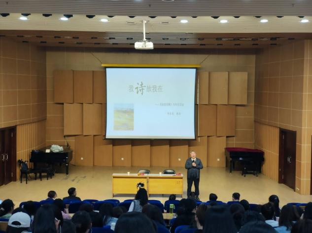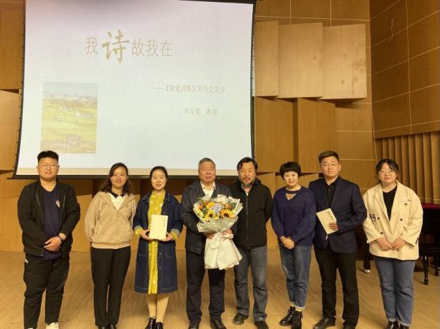 刘自觉教授首先从以自己的名字讲起,他指出所谓“自觉”就是自我觉识与自省,启蒙教化他人,而教育则是一种艺术,是一个灵魂对另一个灵魂的唤醒。其后着重向同学们介绍自己的大山三部曲、小山三部曲、江河三部曲、男人三部曲、花缘五部曲、爱情三部曲、现实三部曲等多首作品。通过对作品的介绍,他提出“写诗三部曲”:首先是写,写诗的过程就是生命存在的过程。其次是诗,诗就是一个人生命存在的结晶。最后是读,当一个诗人的诗被别人记忆和感知时,诗人自身就以诗的形式嵌入别人的灵魂和生命中,并得以持续和趋近于永恒。刘自觉强调自己诗歌创作的主要精神来源来自自己作为农民的儿子、大学教授和中学董事长,得益于此,自己的诗歌有着乡土情怀,并且受到山西民歌和生命美学的影响。