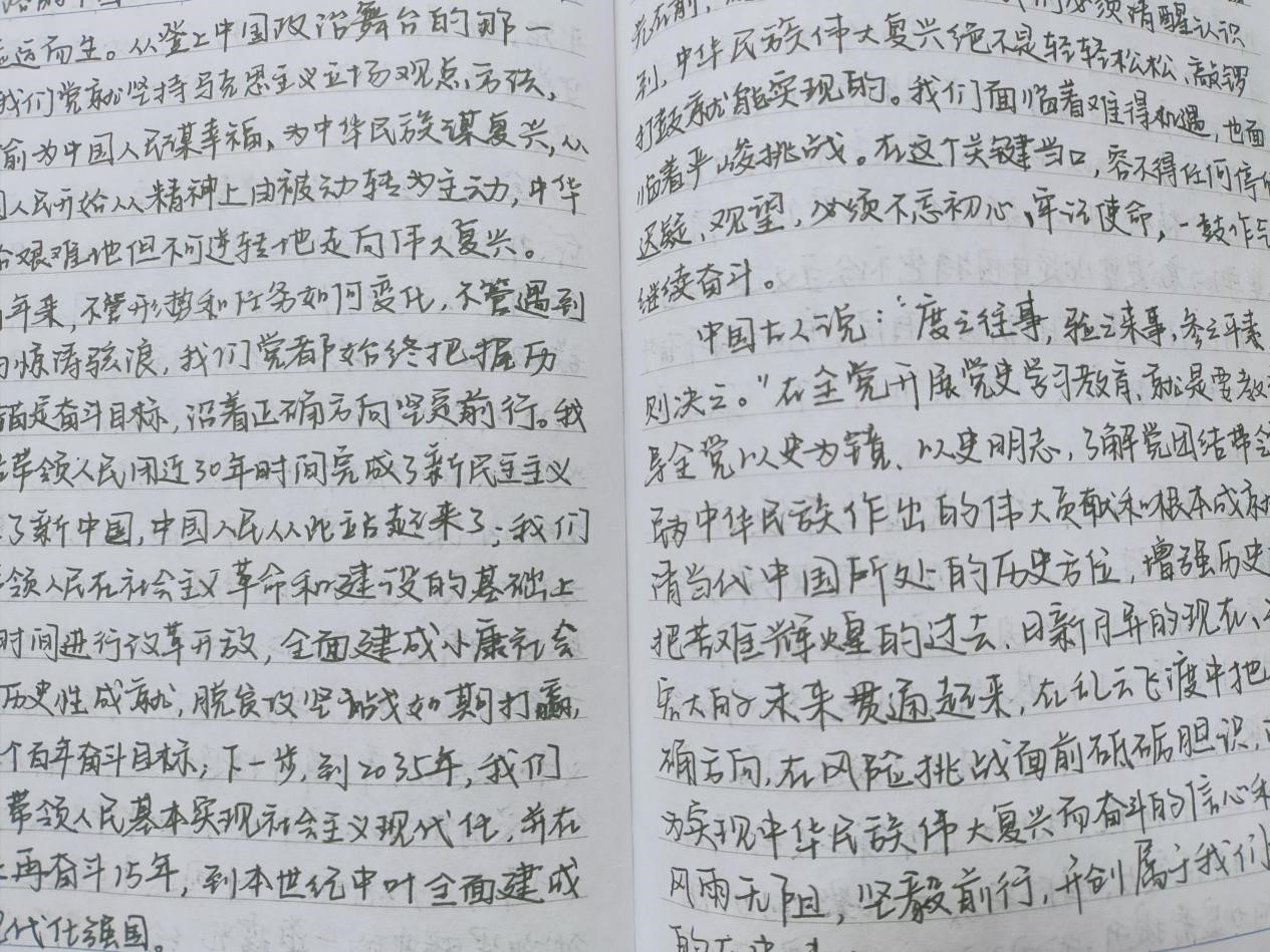 “中国共产党”,这是公司党员党史学习教育笔记本中出现频率最高的词。手写的方式,让烙刻于心的这五个字更加闪耀。党员们在学习笔记本中深情述说了对共产党深恩的赞颂,同时总结学习成果,进行自我反省,坚定理想信念。特别是最近几天,就有同志有感而发地写满了学习笔记本。也有的同志坚持每天记笔记、颂党恩,成为了雷打不动的习惯。百年奋斗的艰辛、历史功绩的宏伟、初心理想的伟大,尽在党员们的笔端。