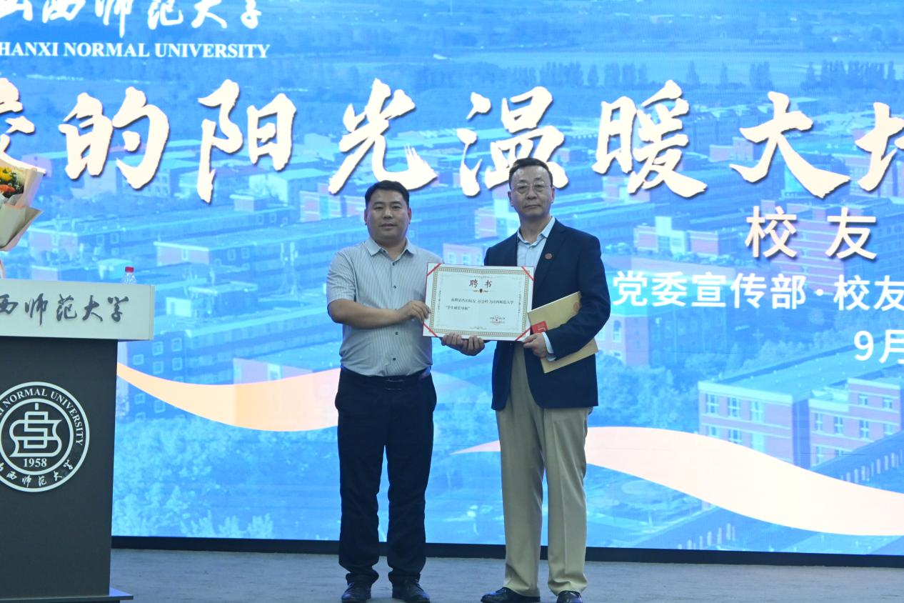 颁奖环节,员工代表为孙金岭佩戴校徽并献上鲜花,陈向波为孙金岭颁发“员工成长导师”聘书并赠送纪念品。
