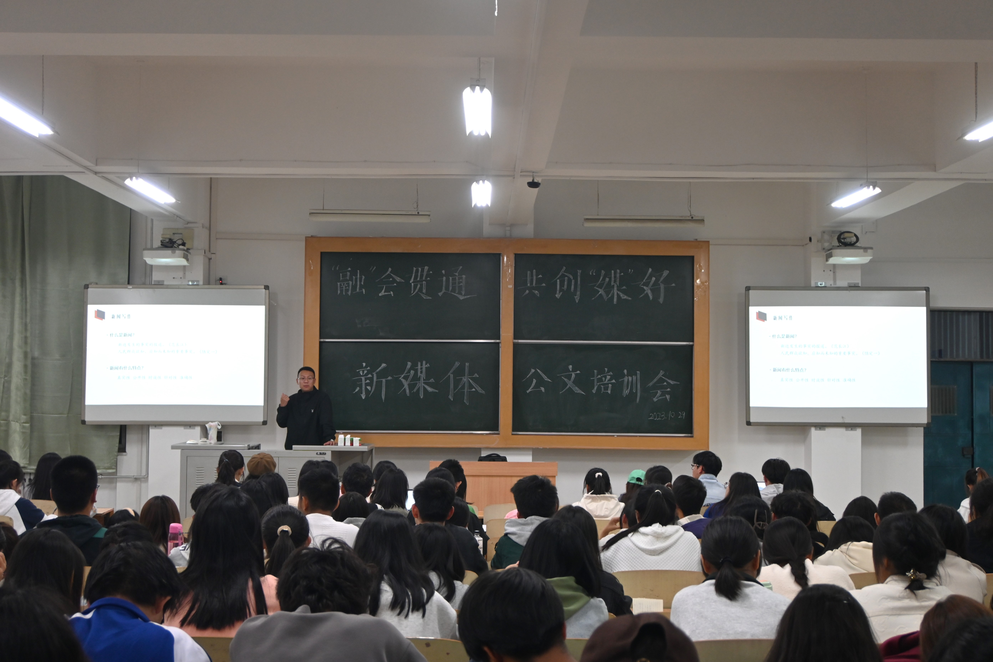 10月27日晚,bg大游官方网站携手数学与计算机公司、马克思主义公司在5209教室举办新媒体公文及摄影培训讲座,特邀bg大游官方网站20届毕业生郭豪杰、22级员工高沛然进行讲解。