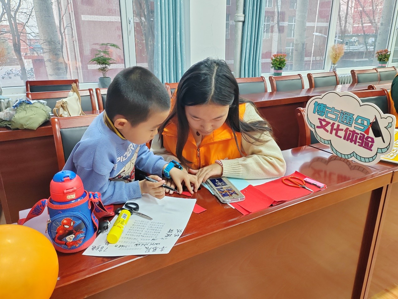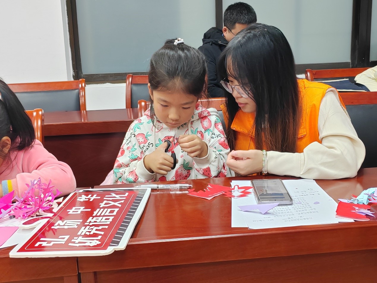 活动现场,气氛热烈而和谐。志愿者向小朋友们展示了有关“雪”的诗词——《逢雪宿芙蓉山主人》和《江雪》,重点讲解了《白雪歌送武判官归京》(节选)。在志愿者的带领下,小朋友们一起朗读诗句、翻译诗句,充分理解诗歌的内容。在诗词讲解之后,活动进行到下一环节——剪纸。小朋友们在志愿者的引导下,开始动手将心中对“雪”的理解和想象用剪纸这一传统艺术形式展现出来。他们认真地折叠、绘画、剪裁,剪出形态各异的雪花。