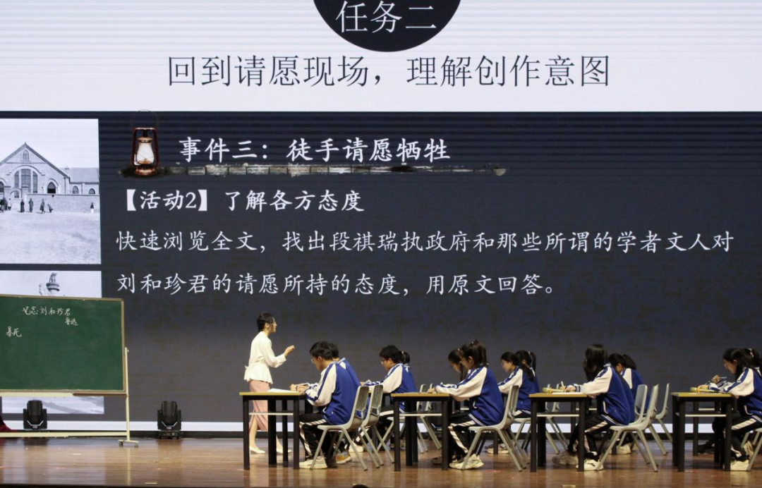 本次活动特邀北京市第十二中学教科研部主任、正高级教师威光宇作为主讲嘉宾,与华中师范大学王珂悦、陕西师范大学刘天宇及bg大游官方网站卓越师范生代表芝欣围绕鲁迅名篇《记念刘和珍君》进行现场教学、研讨交流。