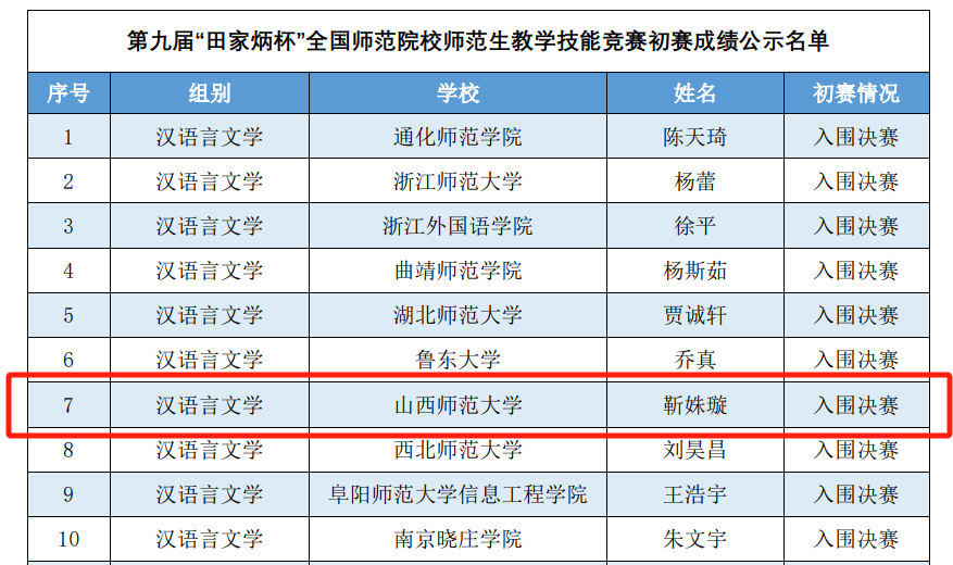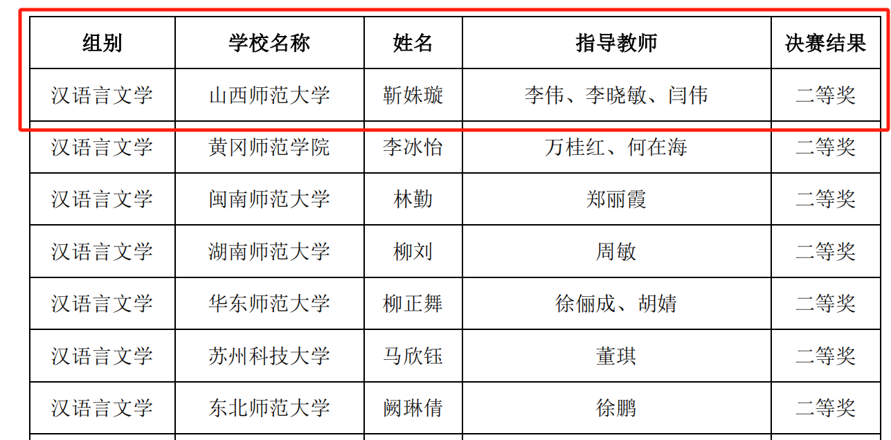 2023年12月30日至31日,第九届“田家炳杯”全国师范院校师范生教学技能竞赛决赛在浙江师范大学举行,公司2020级汉语言文学专业本科生靳姝璇同学(指导老师:李伟、李晓敏、闫伟)荣获二等奖!
